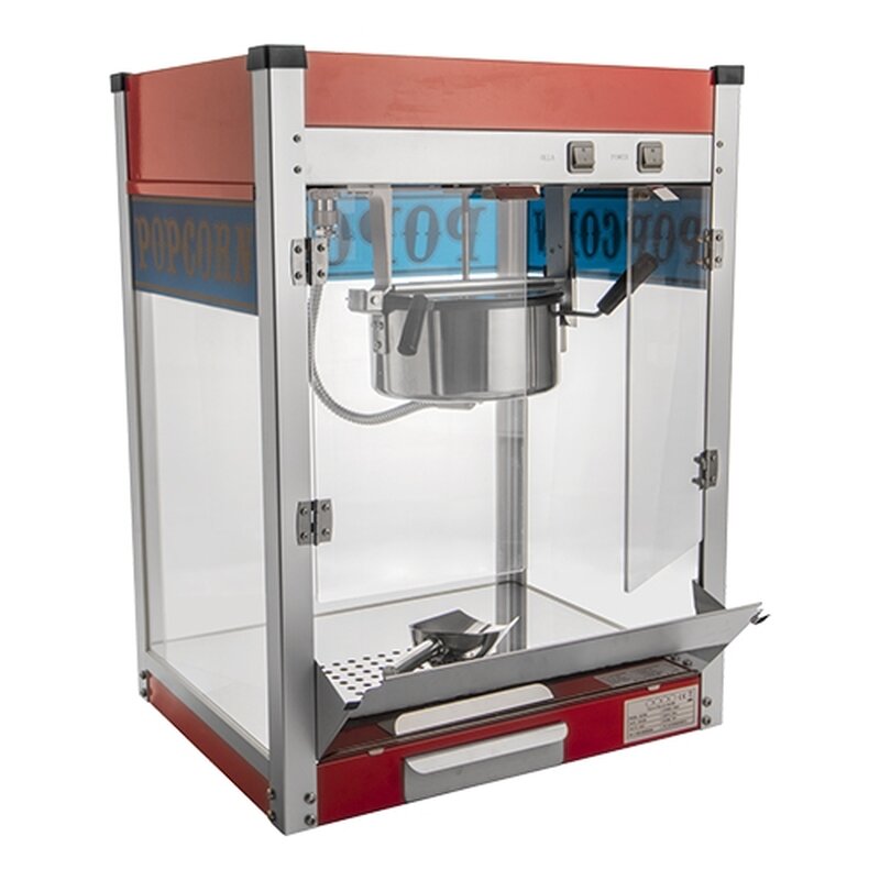 gemakkelijk te bedienen popcorn machine met een eenvoudig leeg te maken ketel die is voorzien van een anti-aanbaklaag, de ruimteverwarming vindt plaats door een warmtelamp en extra element in de bodem waardoor dit apparaat tevens te gebruiken is met kant en klare popcorn