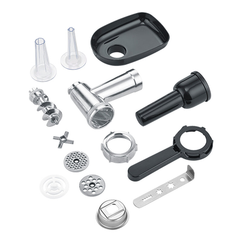 met deze veelzijdige vleesmolen kunt u tot wel drie verschillende bereidingen uitvoeren. Maal vlees met de twee verschillende perforatieschijven, bereid worsten met de twee worstenvullers en maak zandkoekjes met het zandkoekjesopzetstuk. De vleesmolen en geperforeerde schijven zijn duurzaam, smaakneutraal en eenvoudig schoon te maken