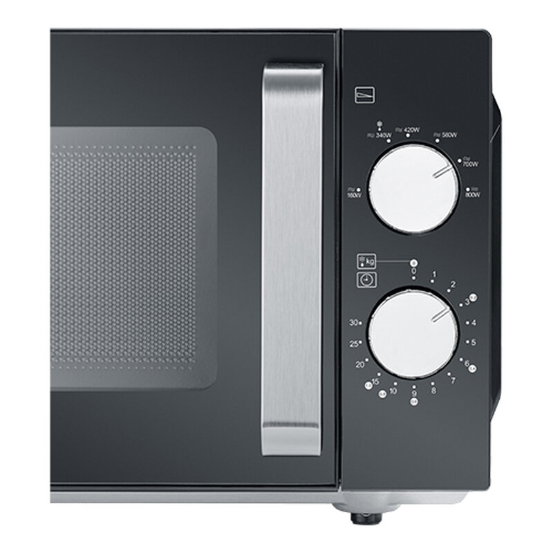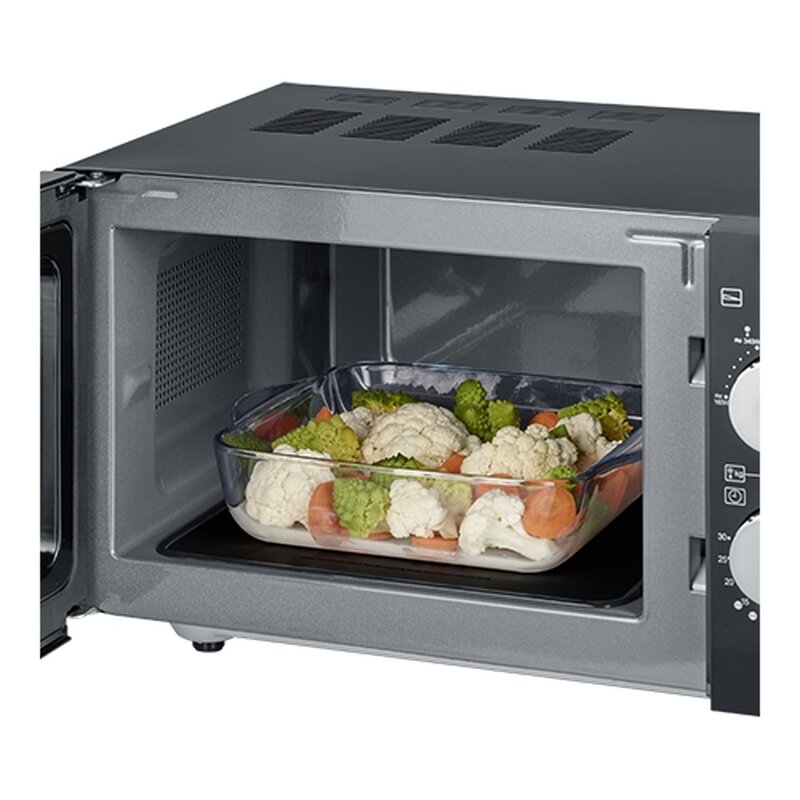 stijlvolle zwarte afwerking aan de buitenzijde en voorzien van keramische bodem aan de binnenzijde. Dankzij de keramische bodem beschikt dit model over een grotere capaciteit en is eenvoudiger schoon te maken. Met 6 verschillende vermogensstanden met o.a. ontdooistand op basis van gewicht of tijd