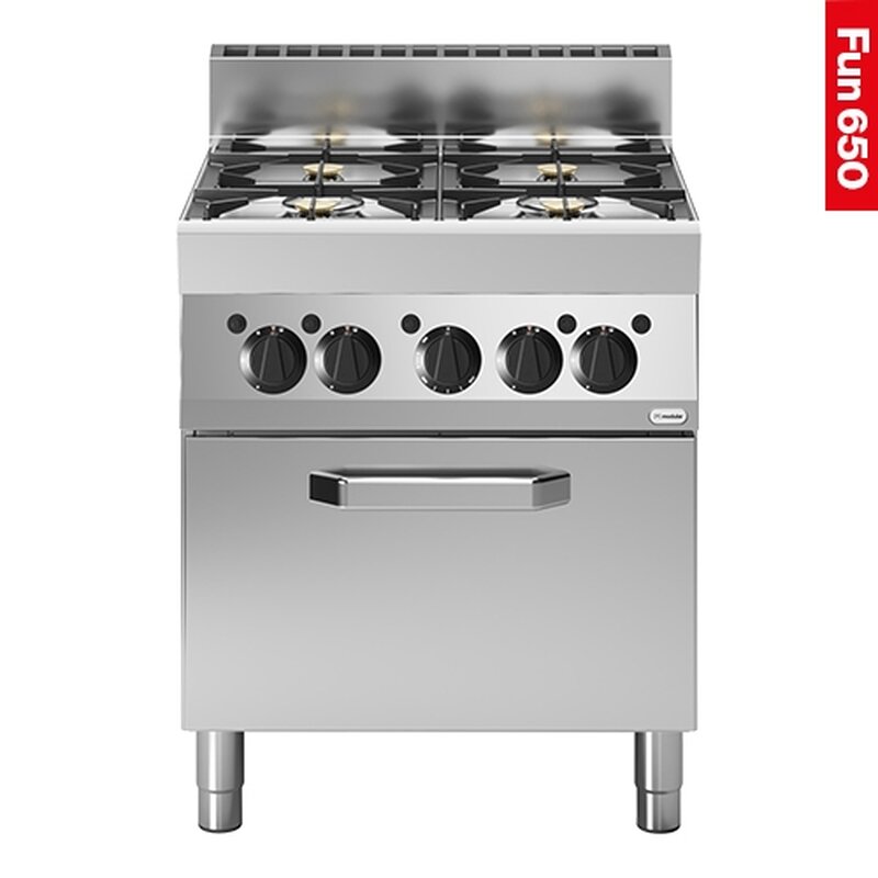 gasfornuis met 4 zware koperen branders voorzien van geëmailleerde morspannen en statische gasoven, de oven heeft een binnenafmeting van 28(H)x57x54cm, met uitneembare geleiders en een rooster van 53x53cm