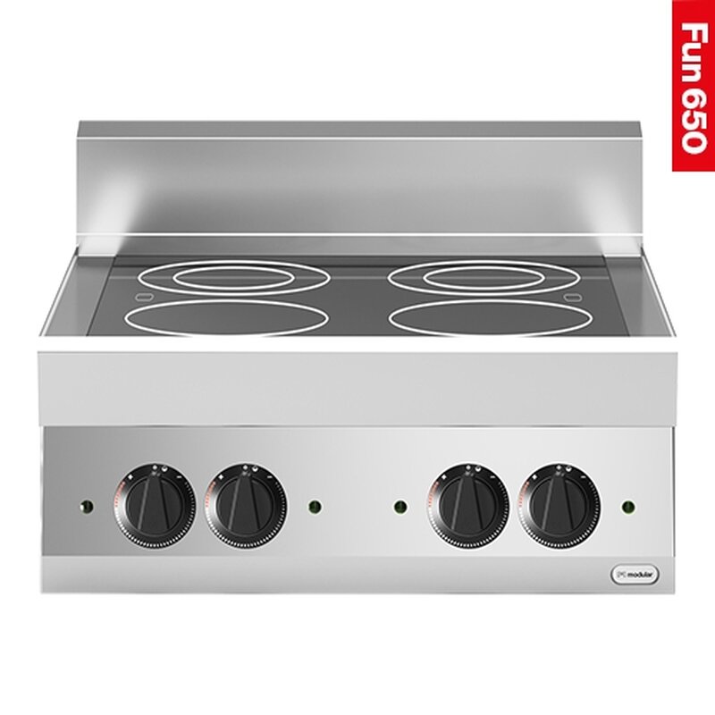 efficiënte infrarood keramische kookplaat met 4 onafhankelijke kookzones met verhittingsoppervlak van Ø20cm en controlelampje per kookplaat, aan de bovenzijde afgedichte keramische plaat en uitgerust met traploze bediening