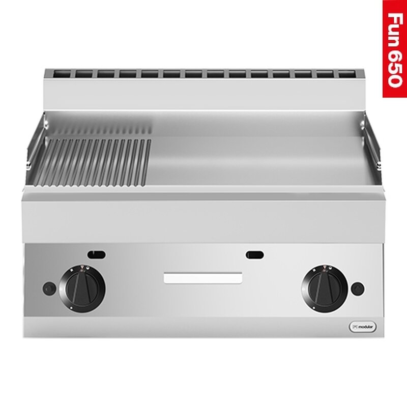 maximaal benut bakplaat oppervlak met zeer korte opwarmtijd d.m.v. een dubbele gasbrander, bakplaat vervaardigd van gegoten en glad geslepen speciaal staal, met extra grote ingebouwde vetopvanglade