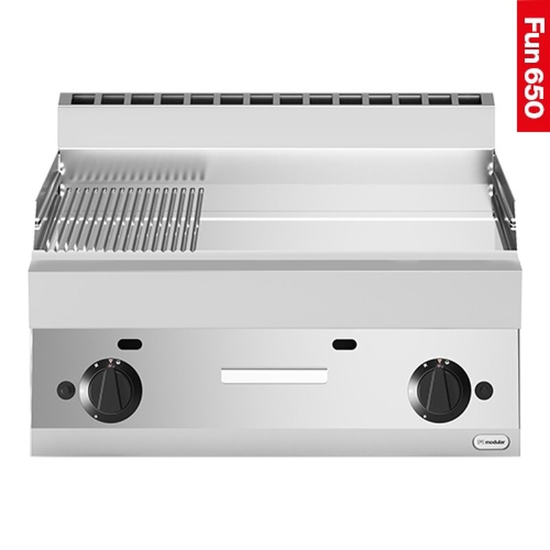 maximaal benut bakplaat oppervlak met zeer korte opwarmtijd d.m.v. een dubbele gasbrander, de verchroomde bakplaat is vervaardigd van gegoten en glad geslepen speciaal staal, met extra grote ingebouwde vetopvanglade
