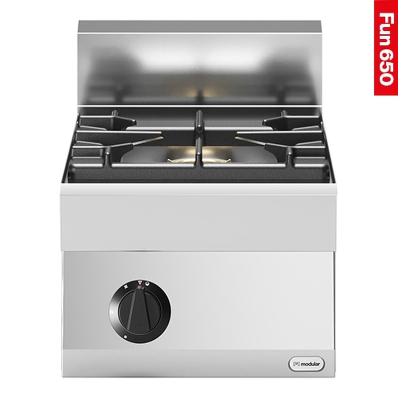 roestvrijstalen behuizing, uitgerust met één grote brander van 7,5kW en een werkrooster van 40x40cm, voorzien van geëmailleerde morspan, waakvlam en thermokoppel