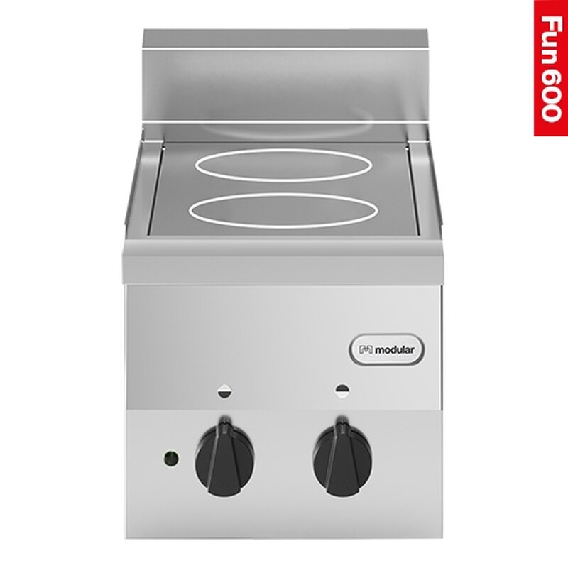 efficiënte infrarood keramische kookplaat met 2 onafhankelijke kookzones met verhittingsoppervlak van Ø20cm en controlelampje per kookplaat, aan de bovenzijde afgedichte keramische plaat en uitgerust met 6 standen schakelaar