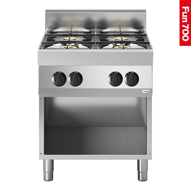 geheel roestvrijstalen uitvoering met open onderbouw, voorzien van geëmailleerde morspannen, koperen branders, thermokoppel en waakvlam, standaard uitvoering op aardgas