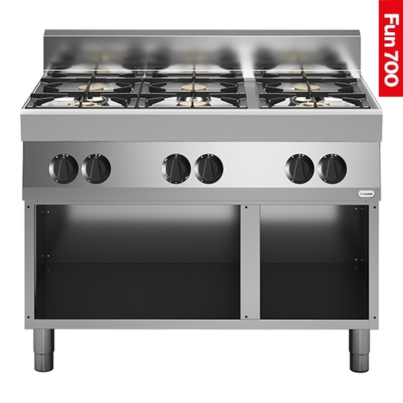 geheel roestvrijstalen uitvoering met open onderbouw, voorzien van geëmailleerde morspannen, koperen branders, thermokoppel en waakvlam, standaard uitvoering op aardgas