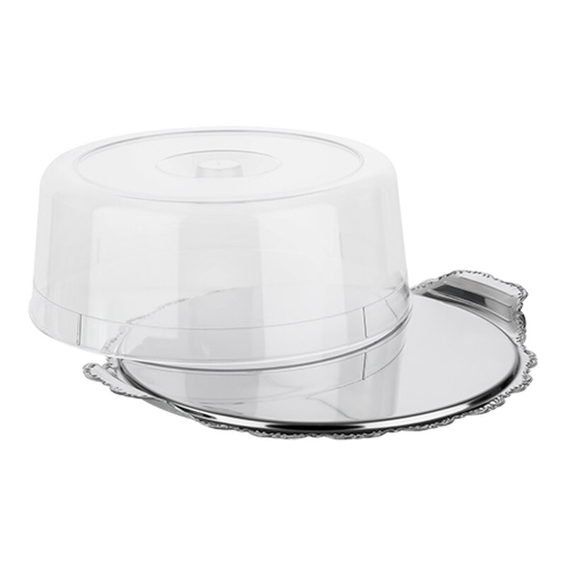 elegant en functioneel serveerplateau met een barok decoratierand en transparante afdekkap, perfect voor het presenteren en beschermen van taarten, gebak of desserts. De stevige afdekkap houdt stof, insecten en andere verontreinigingen buiten, terwijl de taart volledig zichtbaar blijft dankzij het heldere materiaal