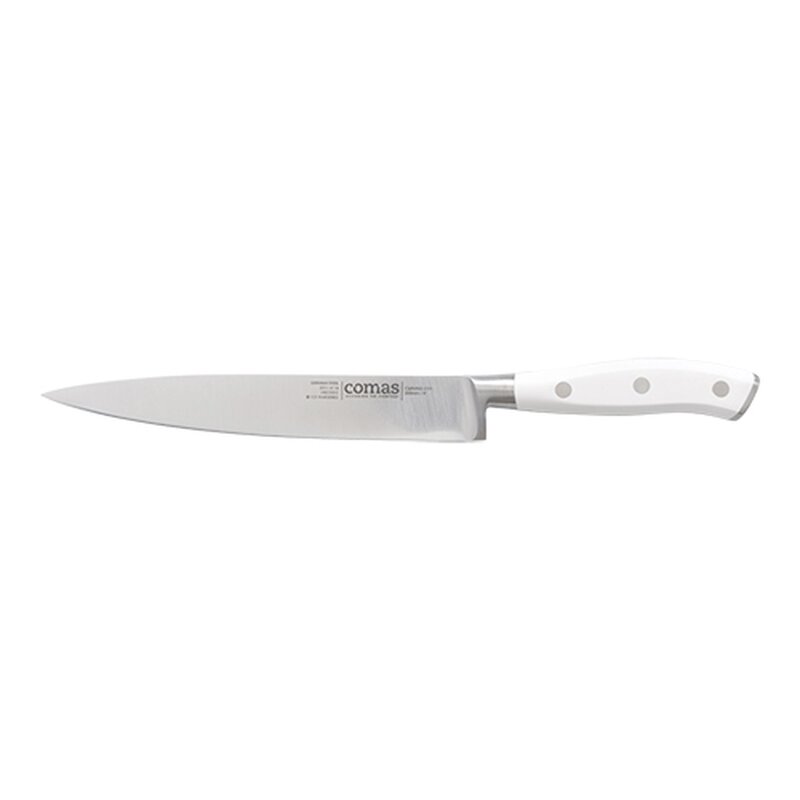 vervaardigd uit hoogwaardig Duits staal, bekend om zijn uitstekende scherptebehoud en weerstand tegen oxidatie en slijtage. Elk mes is zorgvuldig uitgebalanceerd voor optimale controle en comfort, zelfs bij intensief gebruik. Het strakke, witte design voegt een stijlvolle touch toe aan elke keuken