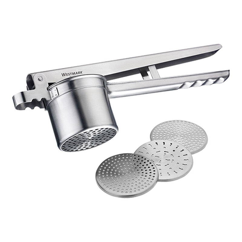 de pureepers wordt geleverd met 4 verwisselbare schijven voor o.a. puree, spätzle, spaghetti-ijs en meer. Het gekartelde handvat en de pansteun zorgen voor een stabiele plaatsing op de pan en een stevige grip. Het hoogwaardige roestvrij staal is na gebruik eenvoudig te reinigen in de vaatwasser
