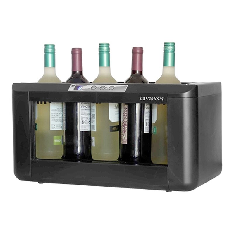 elektro thermisch gekoeld (Peltier), geschikt voor 5 normale flessen of 4 magnumflessen, met regelbare temperatuur 5°C / 18°C, verlichting, LCD display, door de vitrine zijn de flessen goed zichtbaar