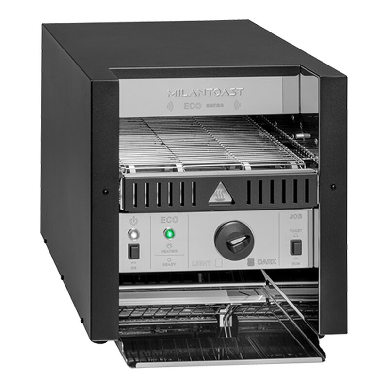 de toastkleur wordt nauwkeurig bepaald door de snelheid van de transportband en de afzonderlijk thermostatisch instelbare boven- en onderverwarming. Dankzij de volledige isolatie straalt de toaster nauwelijks warmte uit en blijft de werkomgeving comfortabel. De getoaste producten worden op temperatuur gehouden op het uitschuifbare warmhoudplateau in de opvangruimte. Dit ECO-model is voorzien van sensoren, waardoor de conveyor toaster alleen start wanneer dat nodig is. Geschikt voor zowel brood als broodjes, zoals hamburgerbroodjes, met een transportband voor twee rijen toast