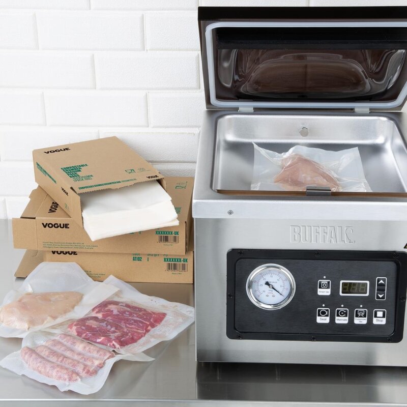 Bewaar en conserveer voedsel langer met 150x250mm Vogue composteerbare chamber vacuümverpakkingszakken. Zeer duurzaam en gebruiksvriendelijk, de zakken zijn een essentiële aanvulling voor elke professionele keuken, bieden efficiënte, hygiënische opslag en helpen om opslagstijden met wel 3-5 dagen te verlengen.