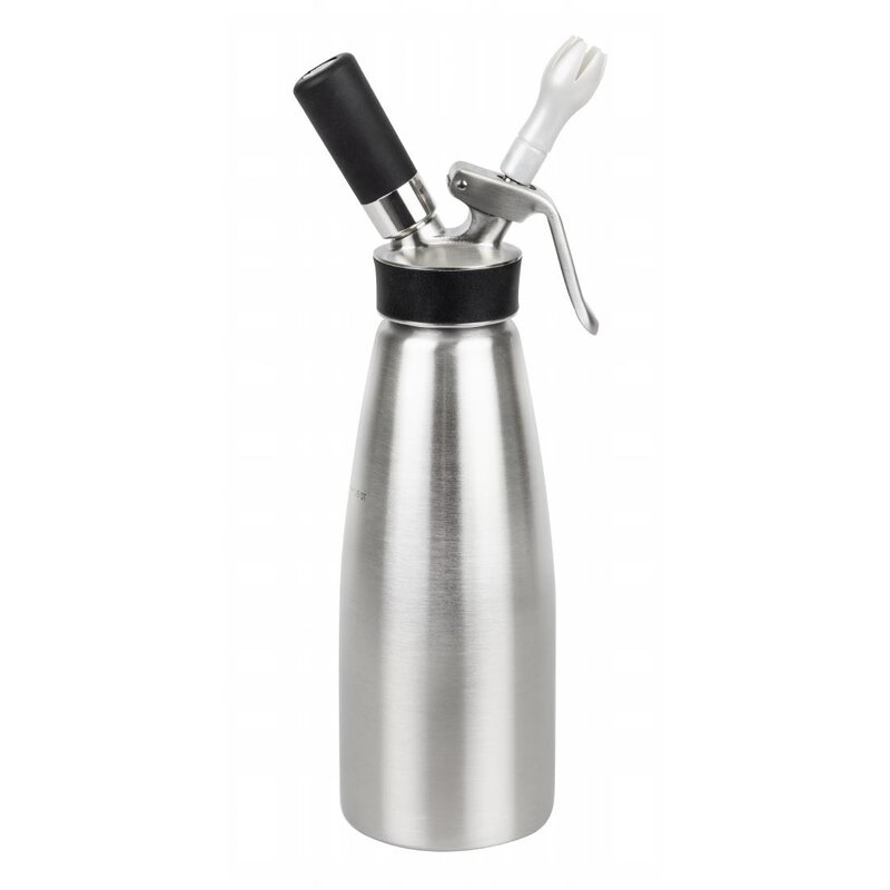 RVS slagroomapparaat geschikt voor gekoelde slagroom. Wordt geleverd met 3 spuitmonden voor een verscheidenheid van decoratieve effecten met room of sauzen. Vaatwasserbestendig.