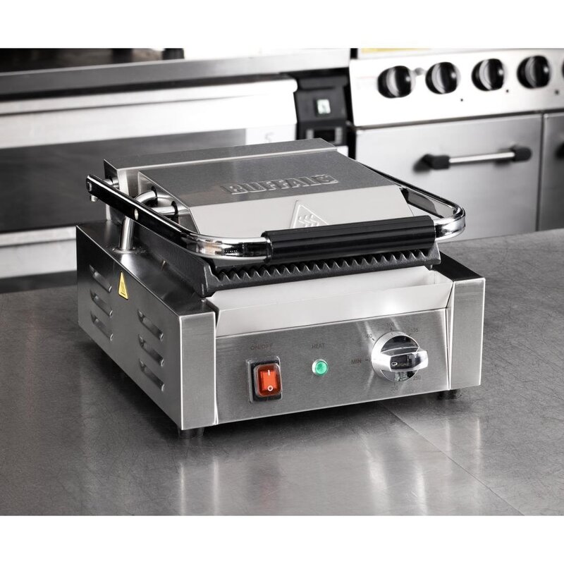 Vermogen: 1.5kW. Enkele grill. Geribbelde boven- en onderplaten