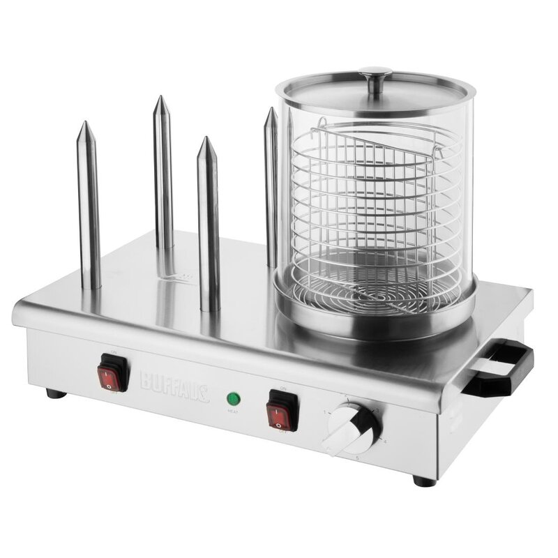 Hotdogs worden warm gehouden in glazen cilinder volgens het bain marieprincipe. Broodjes worden warm gehouden op de aluminium pinnen. RVS-basis, mandje en rubberen antislipvoetjes.