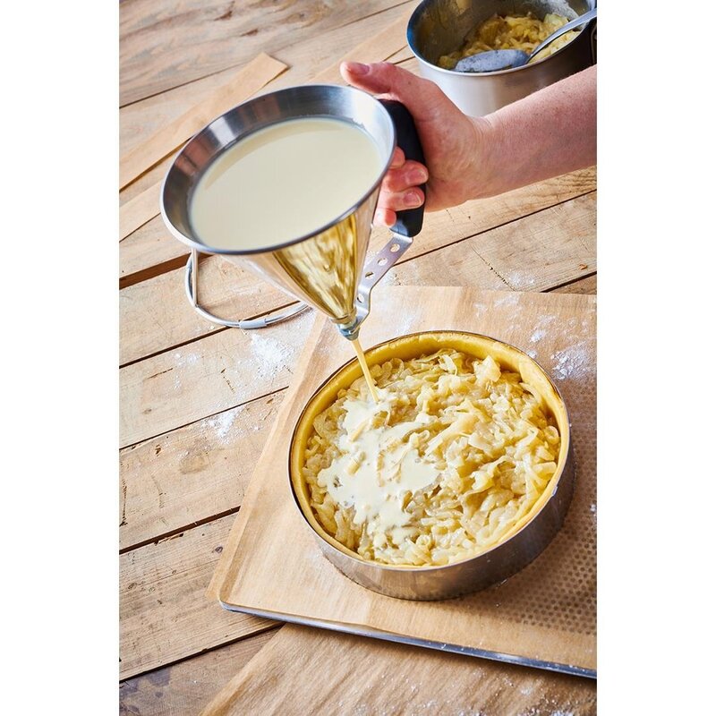 Geheel RVS trechter om eenvoudig kleine hoeveelheden saus of room te kunnen doseren. Geleverd met antislip standaard en 7mm (Ø) spuitmond. Vaatwasserbestendig.