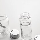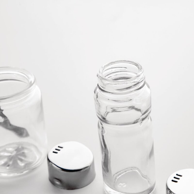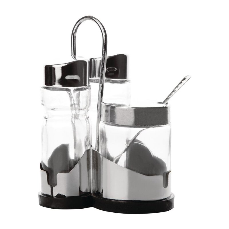 3-delige set, bestaande uit roestvrijstalen houder met zwarte kunststof voet, glazen peper-en zoutstrooier en glazen mosterdpotje. Voorzien van roestvrijstalen deksels.
