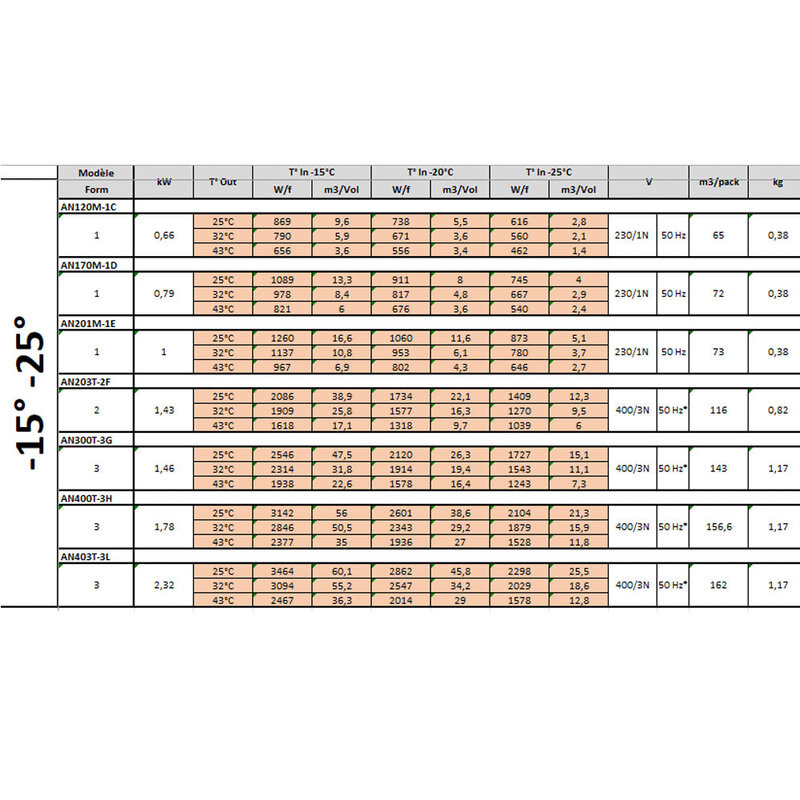 - Koelvermogen 817 (W/f) voor kamerinhoud 4,8 m³/4800L (T° intern -20°C & T° extern +32°C).