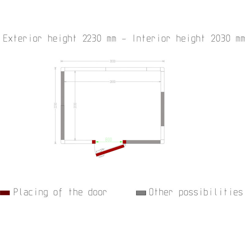 - Deur met bruikbare doorgang 800x1900 mm (deur positionering naar keuze, aan alle 4 zijden).