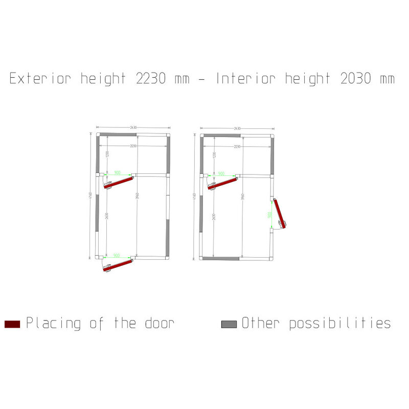 - Twee deuren met een bruikbare doorgang van 900x1.900mm (de deur kan naar keuze op de drie zijden geplaatst worden).