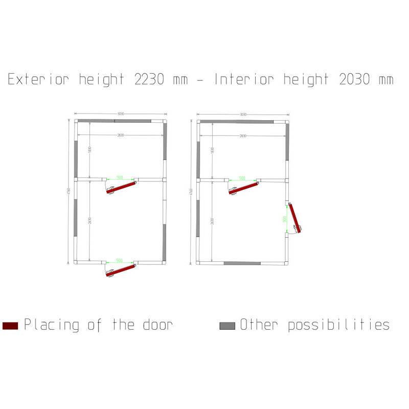 - Twee deuren met een bruikbare doorgang van 900x1.900mm (de deur kan naar keuze op de drie zijden geplaatst worden).