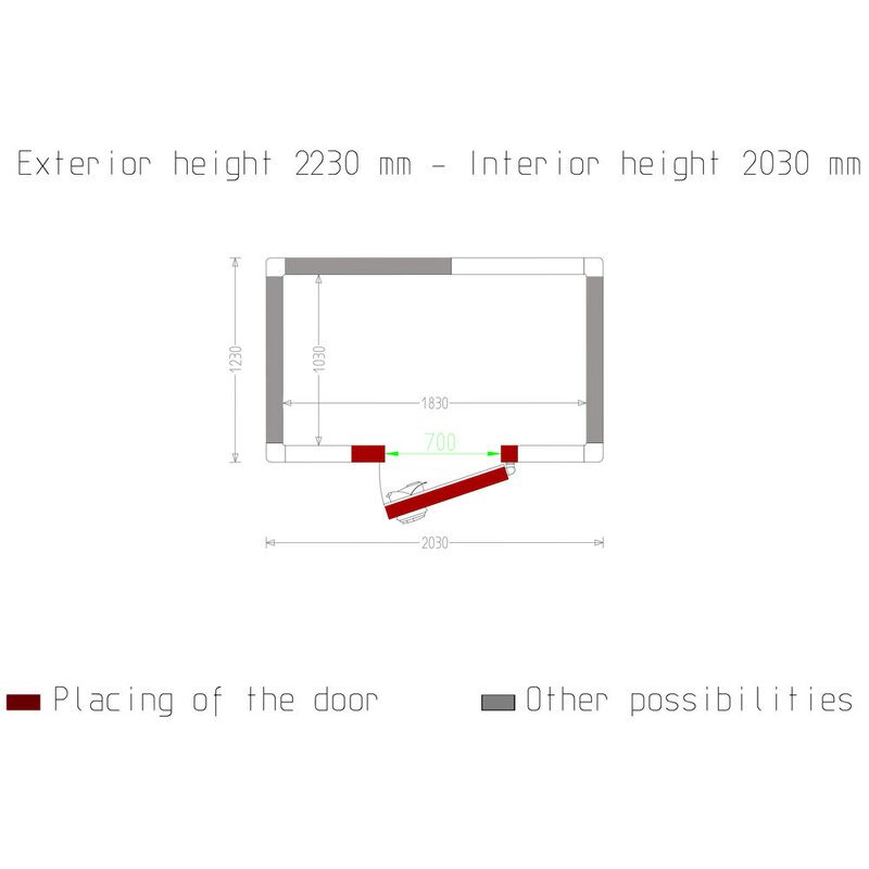 - Deur met bruikbare doorgang 700x1900mm (deurpositionering naar keuze, aan alle 4 zijden).