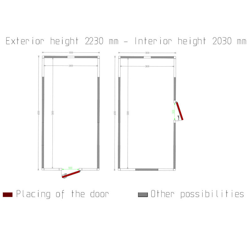 - Deur met bruikbare doorgang 900x1900mm (deurpositionering naar keuze, aan alle 4 zijden).