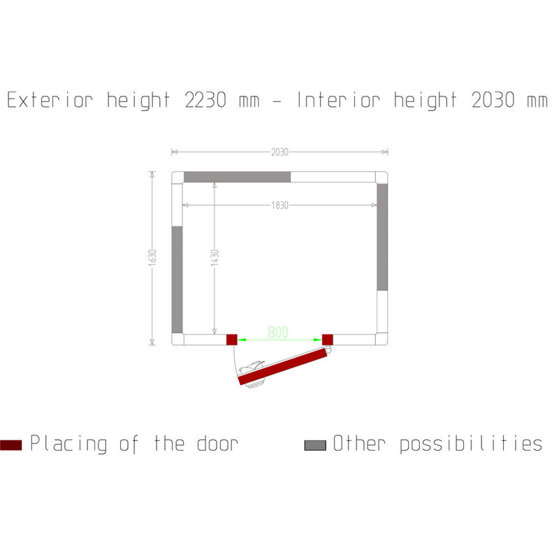 - Deur met bruikbare doorgang 800x1900mm (deurpositionering naar keuze, aan alle 4 zijden).