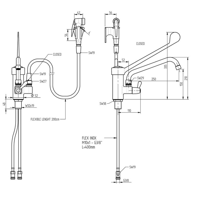 - Sproeier lengte 2000mm, met muurbevestiging.