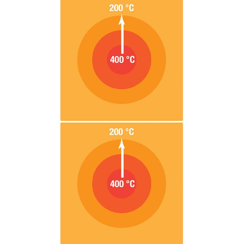 - Plaat (15 mm) in "thermo-diffuserend” staal, verwarmd door, aan de onderkant geplaatste, weerstanden.