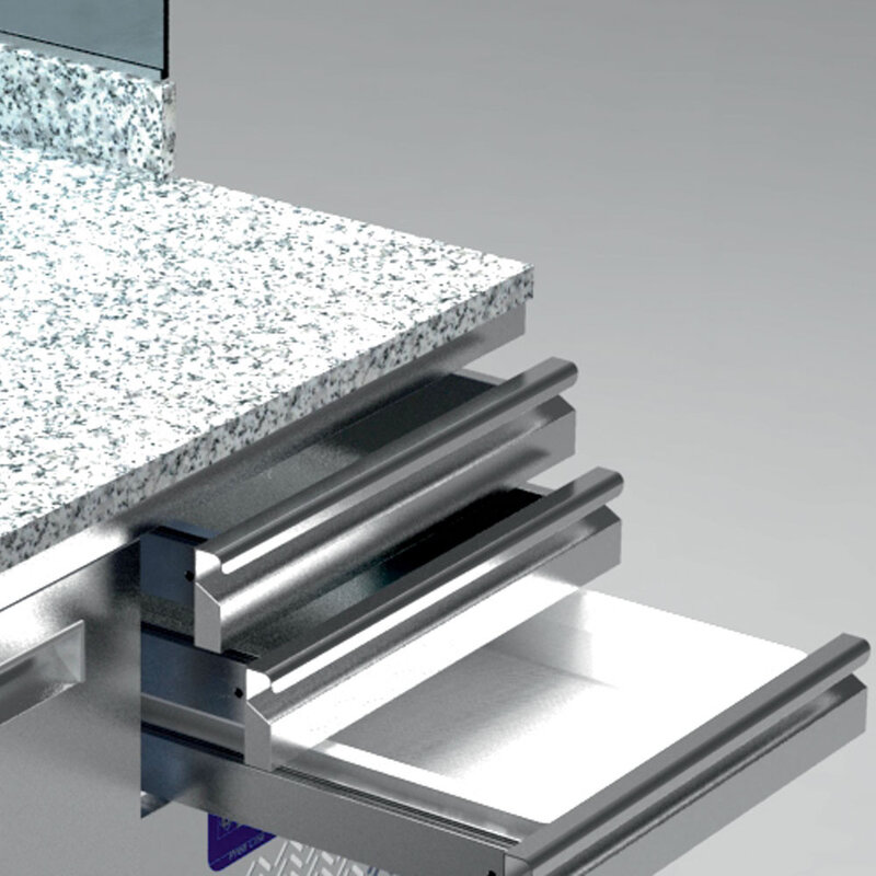 - Ingebouwde koelstructuur, met ruiten (ademend scherm), 8x GN ¼ h150 mm (bakken in optie).