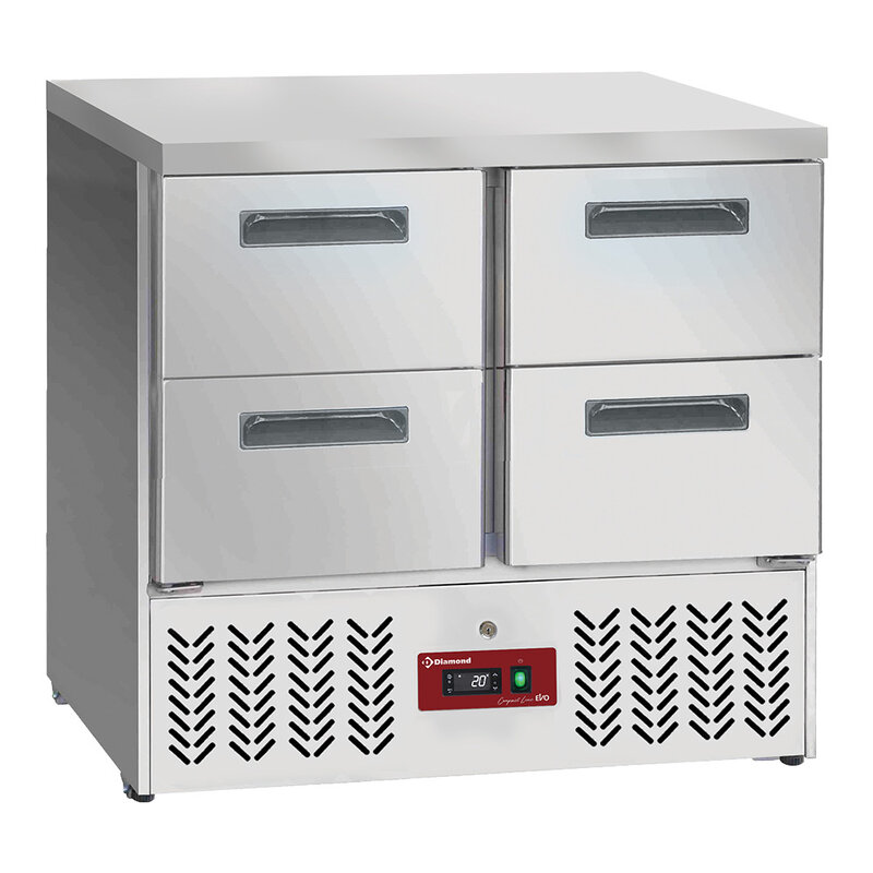 - De nieuwe Compact Line EVO-tafels zijn "milieuvriendelijk" omdat ze het milieuvriendelijke koelmiddel R600a of R290 gebruiken. Laag energieverbruik, nog efficiëntere koelcomponenten, elektronische controller. Speciaal ontworpen voor horecagelegenheden waar ruimte een belangrijke overweging is. Compressorunit op geleiders, toegang met sleutelslot, 4 wielen en 2 verstelbare poten... Een onverslaanbare prijs-kwaliteitverhouding!