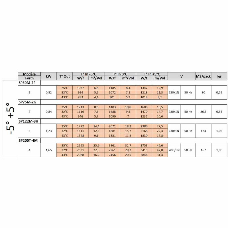 - Koelvermogen 2961 (W/f) voor een kamerinhoud van 28,2 m³ / 28200 liter (Interne T° 0°C & Externe T° +32°C).