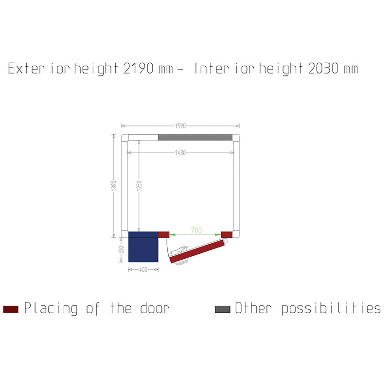 - Interne afmetingen 1430 x 1230 x h 2030 mm