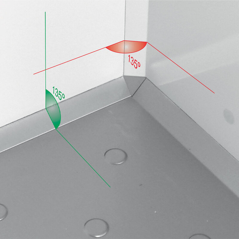 - Hoeken van de bodem, plafond en de panelen, zijn allemaal 135° " sanitair ".