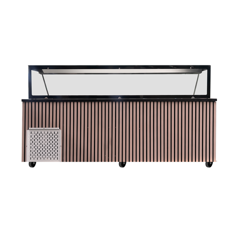 Temperatuurbereik: 0°C tot +8°C Koelsysteem: Geforceerde lucht (convectie) koeling voor gelijkmatige temperatuurverdeling Deuren: 4 zelfsluitende deuren met koelbasis voor gemak en energiebesparing Interieur: Eén set rails met steunrooster (325x630 mm) per deur Mobiliteit: Geleverd met gemonteerde wielen (rolletjes op aanvraag) Werkblad: Luxe Star Galaxy Black graniet, 30 mm dik Frontontwerp: Elegante houtlook panelen Diepte: 820 mm Geleverd zonder GN containers Technische specificaties Klimaatklasse: 4 (omgevingstemperatuur +30°C, relatieve luchtvochtigheid 55%) Koelsysteem: Plug-and-play ontwerp Optioneel accessoire: Helder glazen deksel met LED-verlichting Glazen deksels bevatten twee acrylglas panelen aan de bedieningszijde Alle glasaccessoires uitgerust met geïntegreerde LED-verlichting
