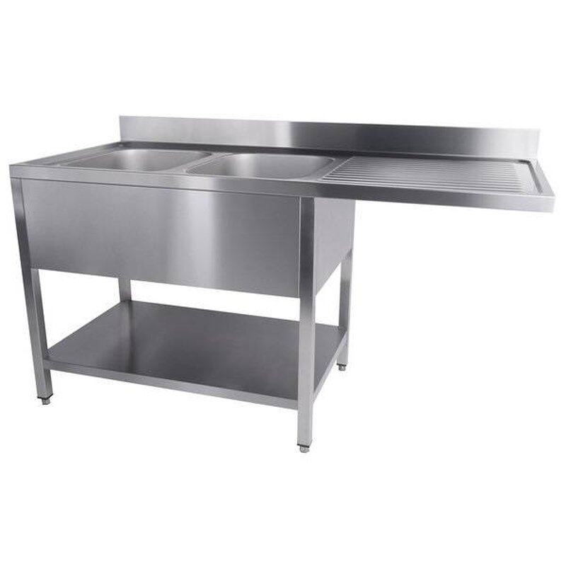afmetingen 1600 mm breed, 700 mm diep en 850 mm hoog, is een functionele en duurzame aanvulling voor elke keuken. Het geheel is vervaardigd uit roestvrij staal, wat zorgt voor een hoge mate van hygiëne, corrosiebestendigheid en eenvoudig onderhoud. De opbouw is voorzien als zelfmontage, wat flexibiliteit en efficiënte logistiek biedt. De spoelbak beschikt over twee spoelbakken, beide aan de linkerkant gepositioneerd, elk met een afmeting van 400 mm breed, 500 mm diep en 250 mm hoog. Deze configuratie is ideaal voor het scheiden van taken, zoals voorweken en afspoelen. Aan de rechterzijde is een ruim afgootblad geïntegreerd, dat optimale ruimte biedt voor het drogen van servies en keukengerei. Met zijn robuuste constructie en praktische indeling is deze spoelbak bij uitstek geschikt voor horecagebruik of professionele keukens waar efficiëntie en duurzaamheid essentieel zijn. De combinatie van twee spoelbakken en een afgootblad zorgt voor een gestroomlijnde werkstroom.