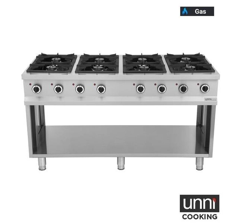 De UnniCooking OCK-8 gasfornuis is een professionele keuze voor elke horecakeuken, nu voorzien van geüpgradede Italiaanse branders. Deze branders bieden een maximaal vermogen van 6,5 kW per brander en zijn uitgerust met dubbele overlappende vlammen. Dit resulteert in een intense en geconcentreerde hitte, ideaal voor uiteenlopende bereidingstechnieken zoals grillen, sudderen en sauteren. Een opvallend kenmerk zijn de nieuwe verticale branders, die een hoog vermogen combineren met een verlaagd gasverbruik voor een efficiëntere werking. Daarnaast beschikt elk fornuis over een geïntegreerde waakvlam, wat zorgt voor een betrouwbare en constante ontsteking. Voor eenvoudig onderhoud zijn de opvangschotels geëmailleerd, waardoor ze eenvoudig schoon te houden zijn. Deze verbeterde branders zorgen niet alleen voor snellere en preciezere kookresultaten, maar creëren ook een elegante visuele uitstraling in uw keuken. De OCK-8 vertegenwoordigt daarmee de perfecte balans tussen kracht, snelheid en precisie voor de veeleisende professionele gebruiker.