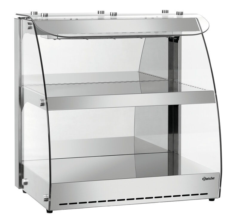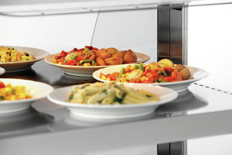 Met de warme bar kunnen gerechten op twee niveaus ruimtebesparend warm worden gehouden. Lampen voor de verlichting van de legvlakken en een spiegel aan de achterzijde zorgen voor een aantrekkelijke presentatie van de gerechten.