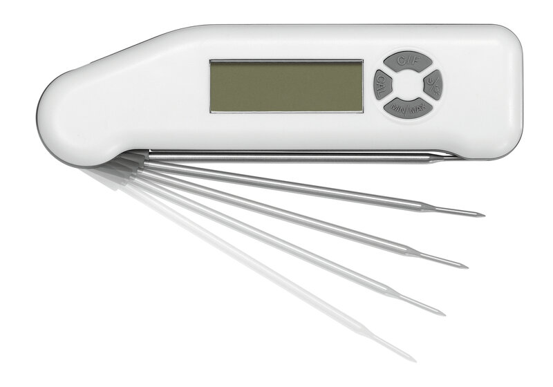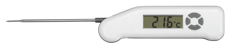 Waterdichte thermometer met uitklapbare kerntemperatuurvoeler. Het grote temperatuurmeetbereik van -40 °C tot +300 °C is net zo overtuigend als het verlichte display en het min/max geheugen.