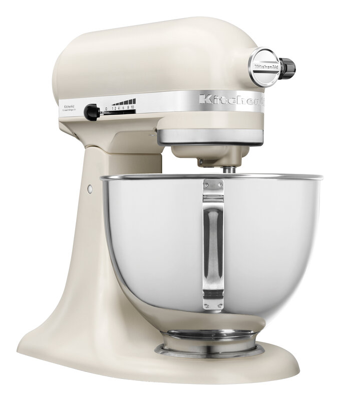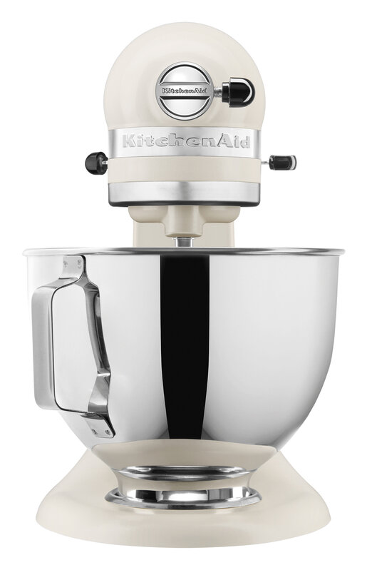De KitchenAid 5KSM95PS in mat porselein met accessoires voor verschillende bewerkingsstappen is een blikvanger in elke keuken.