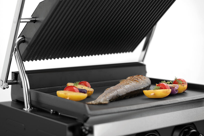 Deze robuuste contactgrill in matzwart heeft een gegroefde en een gladde grillplaat en biedt daardoor maximale flexibiliteit voor een grote verscheidenheid aan bereidingen.klassieke grillstrepen met een zacht gebruind oppervlak - dankzij de optimale warmtegeleiding wordt elk gerecht gelijkmatig gaar. De moderne MDI-besturing met digitale weergave van temperatuur en tijd maakt een bijzonder intuïtieve en nauwkeurige bediening mogelijk.
