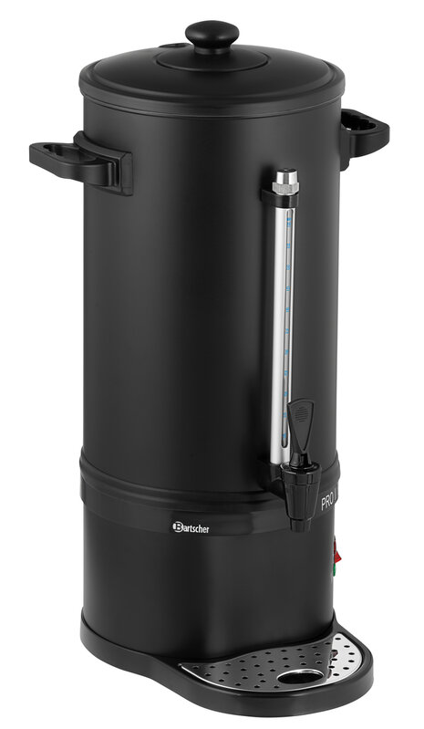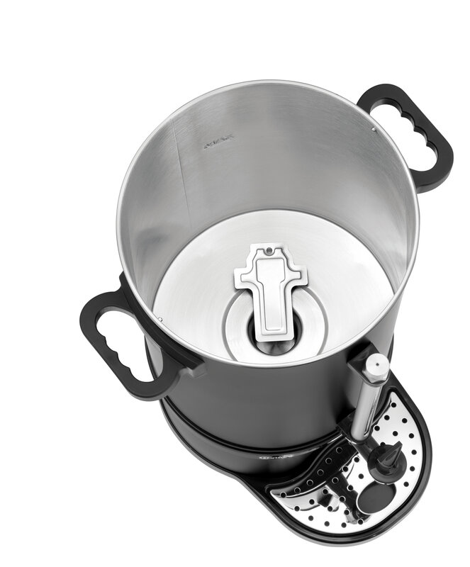 De ronde filterkoffiemachine in matzwart combineert modern design met praktische prestaties voor professioneel gebruik. Met een capaciteit van 9 liter is hij perfect voor middelgrote groepen en continu koffiegenot. Door hun elegante uiterlijk zijn ze een stijlvol hoogtepunt op elke evenementenlocatie.