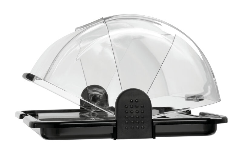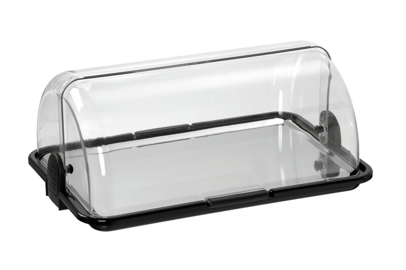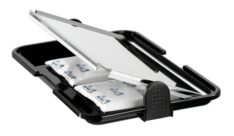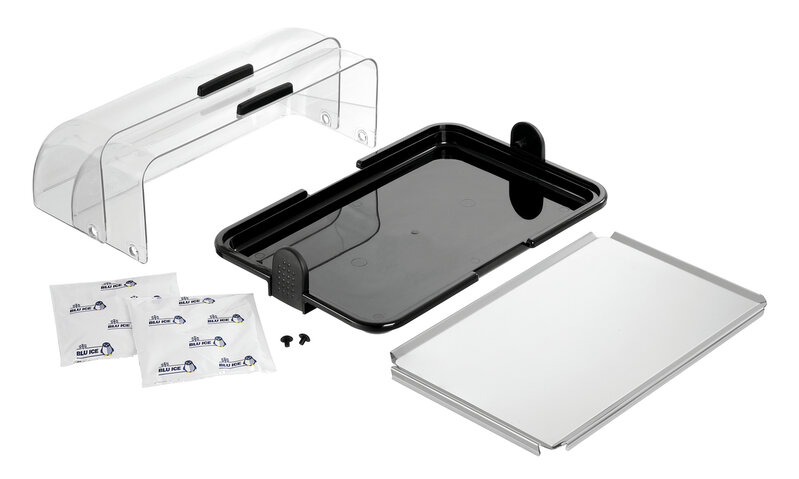 De buffetvitrine houdt voedsel hygiënisch vers en koel. Met haar koelpacks is ze stroomonafhankelijk en kan zodoende vrij bij het buffet worden geplaatst. Het transparante roldeksel biedt zowel een bediening aan beiden zijden als direct zicht op de gepresenteerde delicatessen.