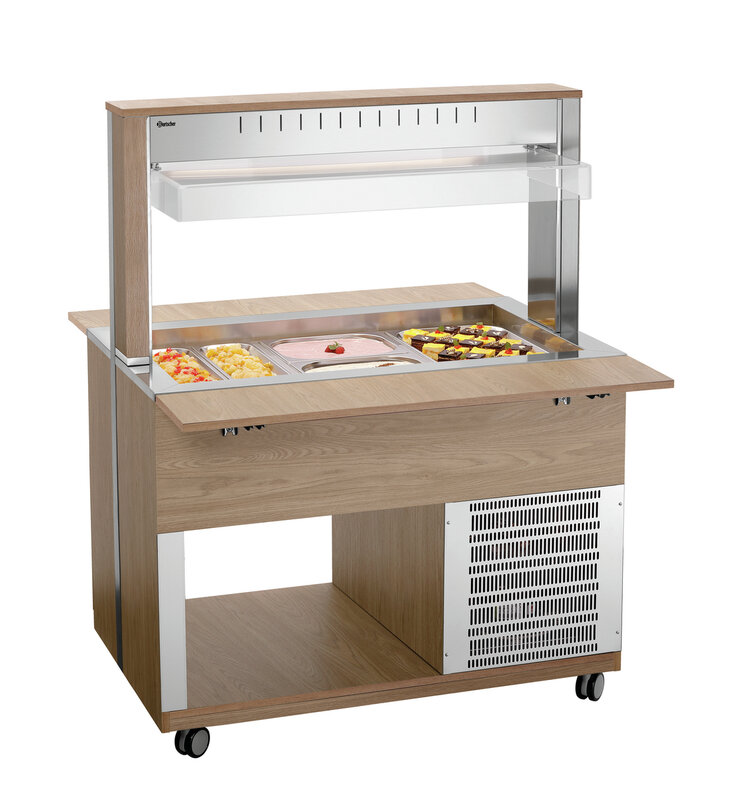 De mobiele buffetoplossing in een modern houtdesign - De buffetwagen met hoestbescherming en led-verlichting voor 3 GN-containers 1/1 GN en houdt gerechten betrouwbaar koud bij het buffet.