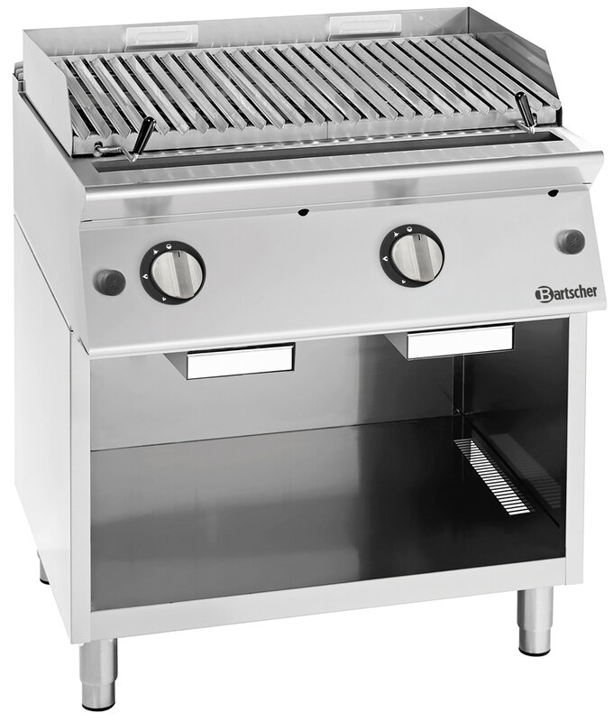 De ruime Lavasteengrill op gas met een breedte van 800 mm en een capaciteit van 14 kg Lavastenen zorgt voor aromatisch gegrild voedsel in de cateringkeuken.