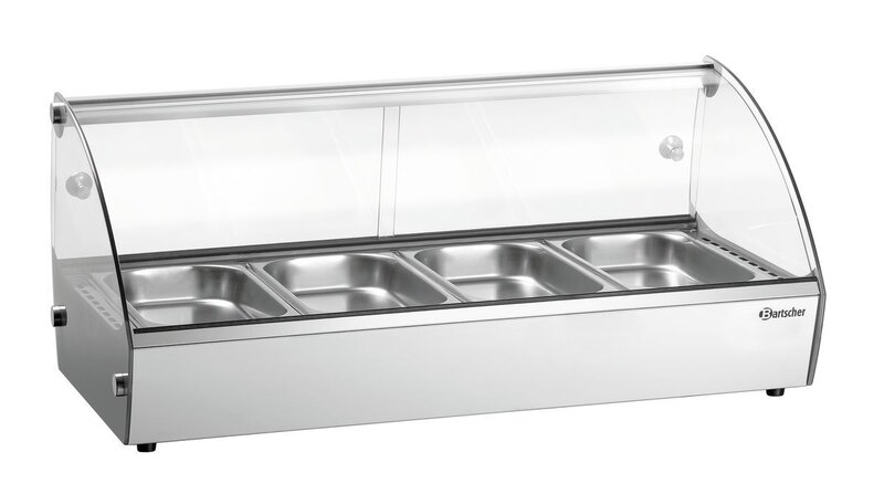 Klein maar fijn: ruimtebesparende opzetvitrine voor uitgifte en presenteren van warm eten.