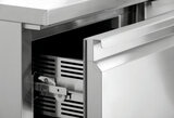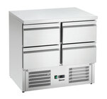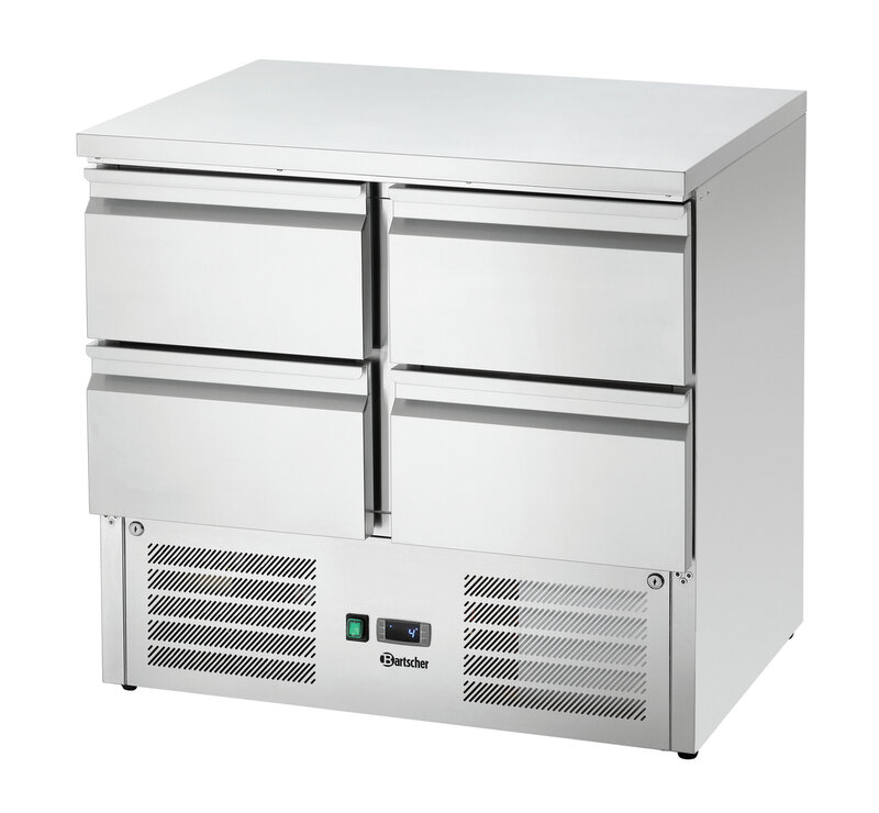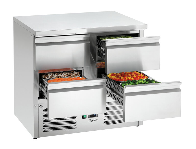 De 4 gekoelde lades van de mini-koeltafel kunnen zowel zonder alsook met GN-reservoirs tot 1/1 GN voor het opbergen worden gebruikt. De voor de vaatwasser geschikte roestvrijstalen filter en de goed toegankelijke technische eenheid maken een eenvoudig, regelmatig onderhoud mogelijk wat resulteert in een langere levensduur.