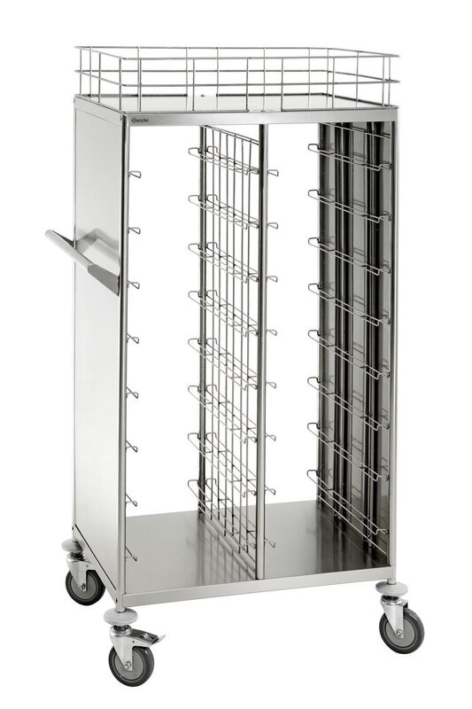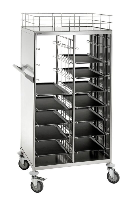 Veelzijdig inzetbare transportwagen met 16 lades – Voor het transport van gevulde 1/1 GN-bakken of voor het afruimen van dienbladen in kantine-norm-formaat.